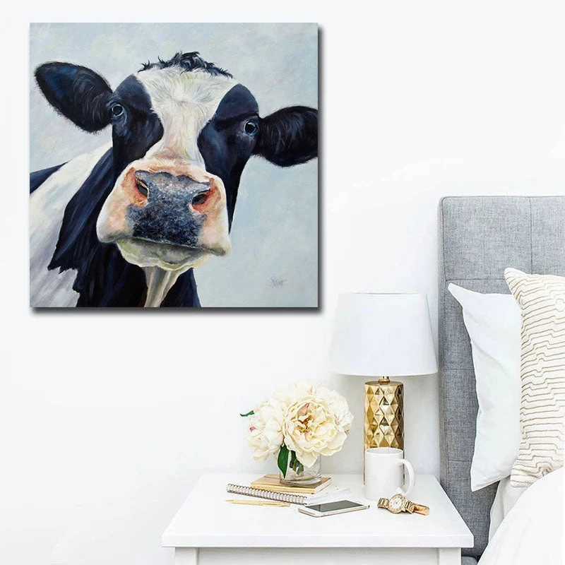 Look whose friendly face popped in to say hello! It is our furry friend ‘Betsy’! With friendly eyes and beautiful details, this jolly cow will always put a smile on your face. Create a comical and rural atmosphere wherever you display this painting!