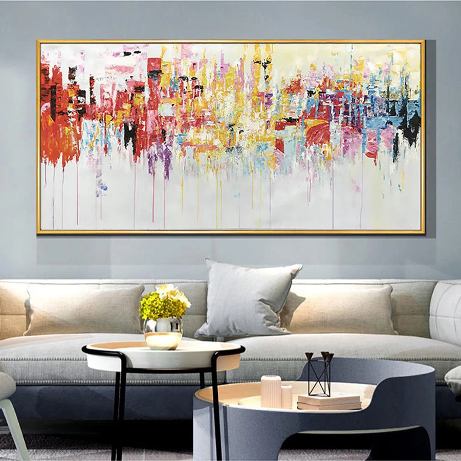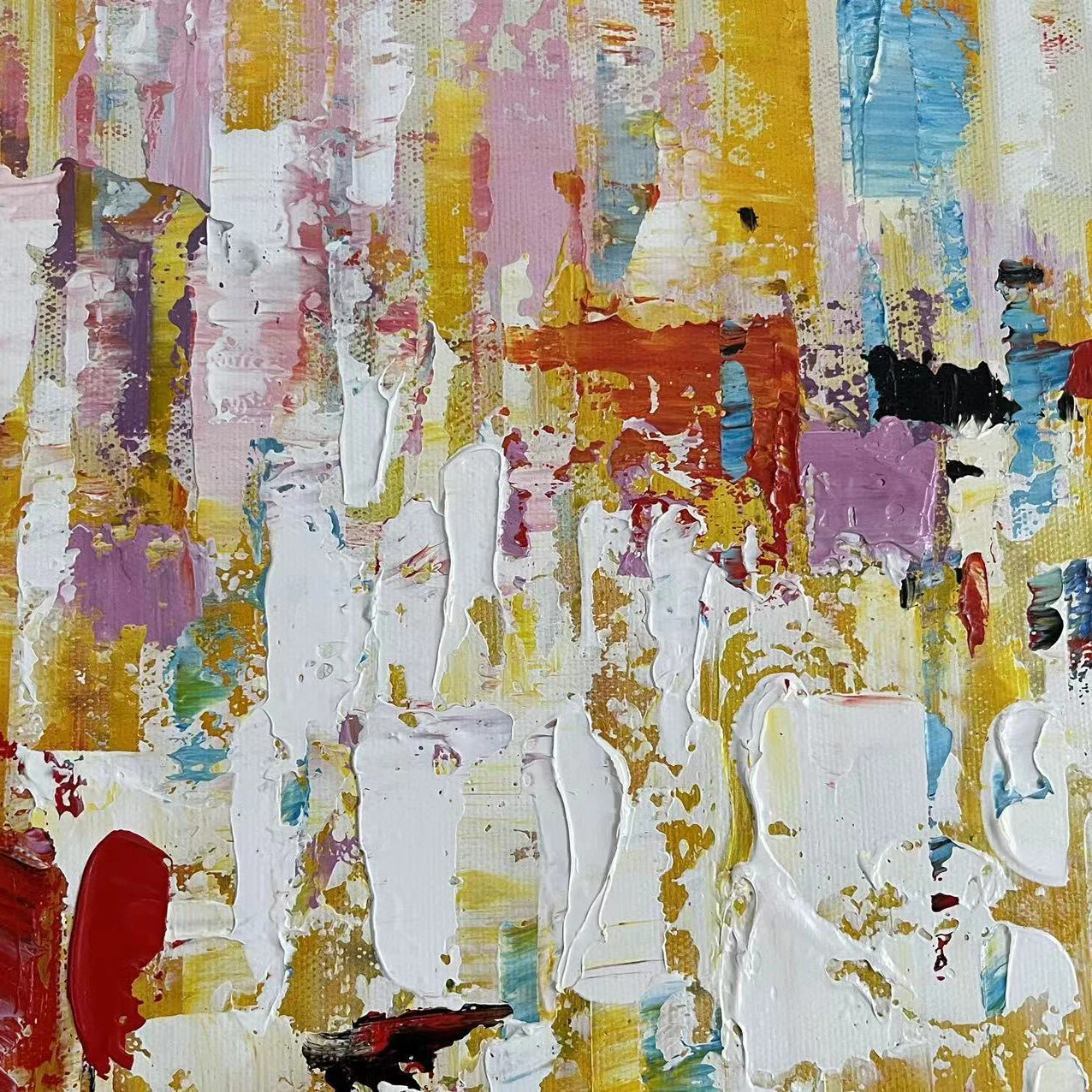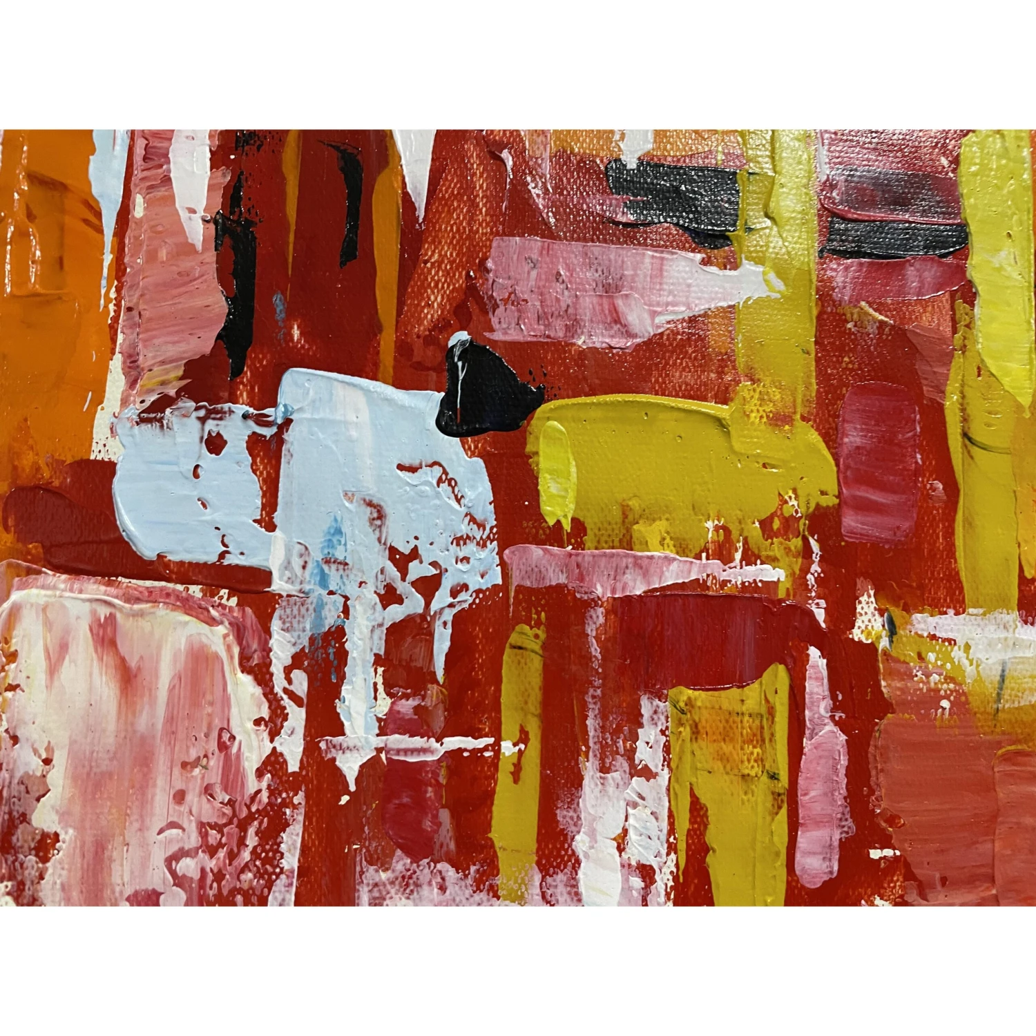 City Skyline brings the vibrancy of urban life into your home with its abstract shapes and bold colors. This painting captures the essence of a bustling cityscape, making it a dynamic addition to any home interior.