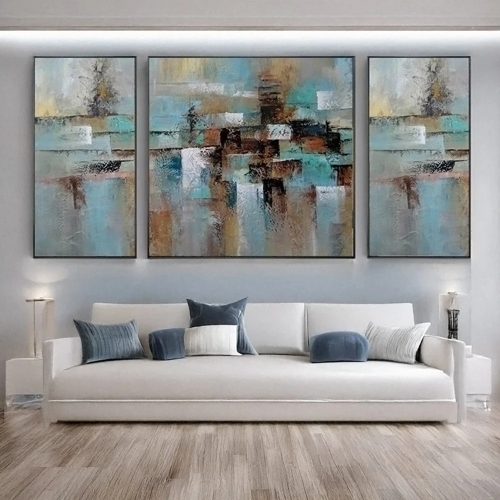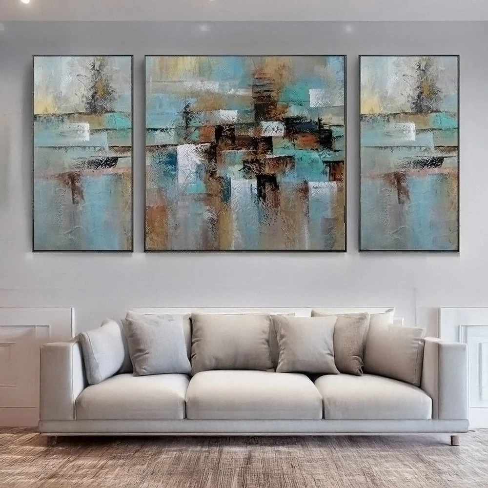 With the use of a special technique, this unique canvas set almost looks like it is covered in a beautiful layer of rust. Brown and blue colors dance along the canvas, giving this canvas set a dynamic and stunning atmosphere!