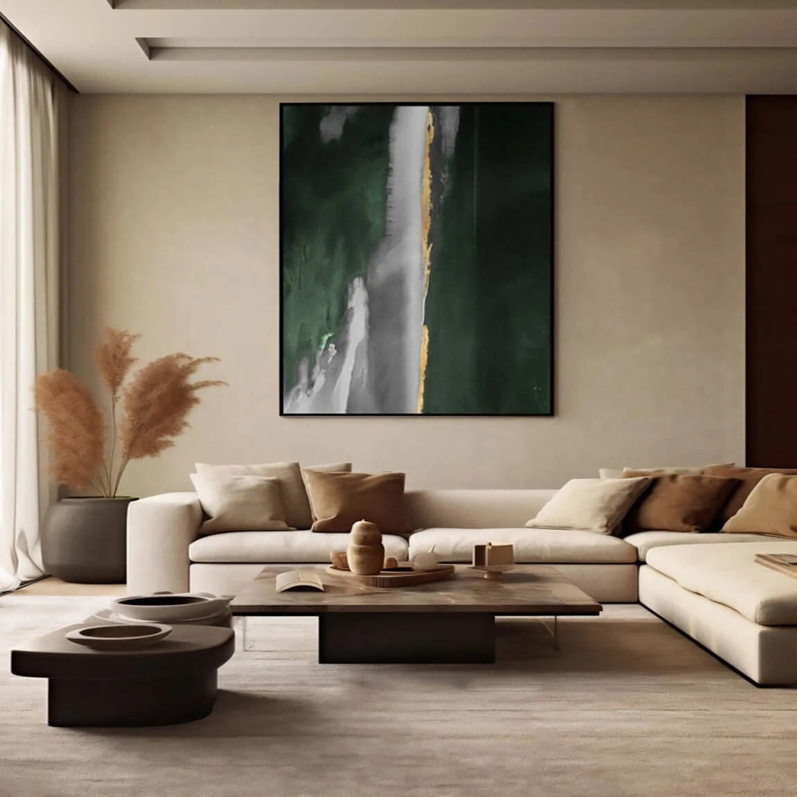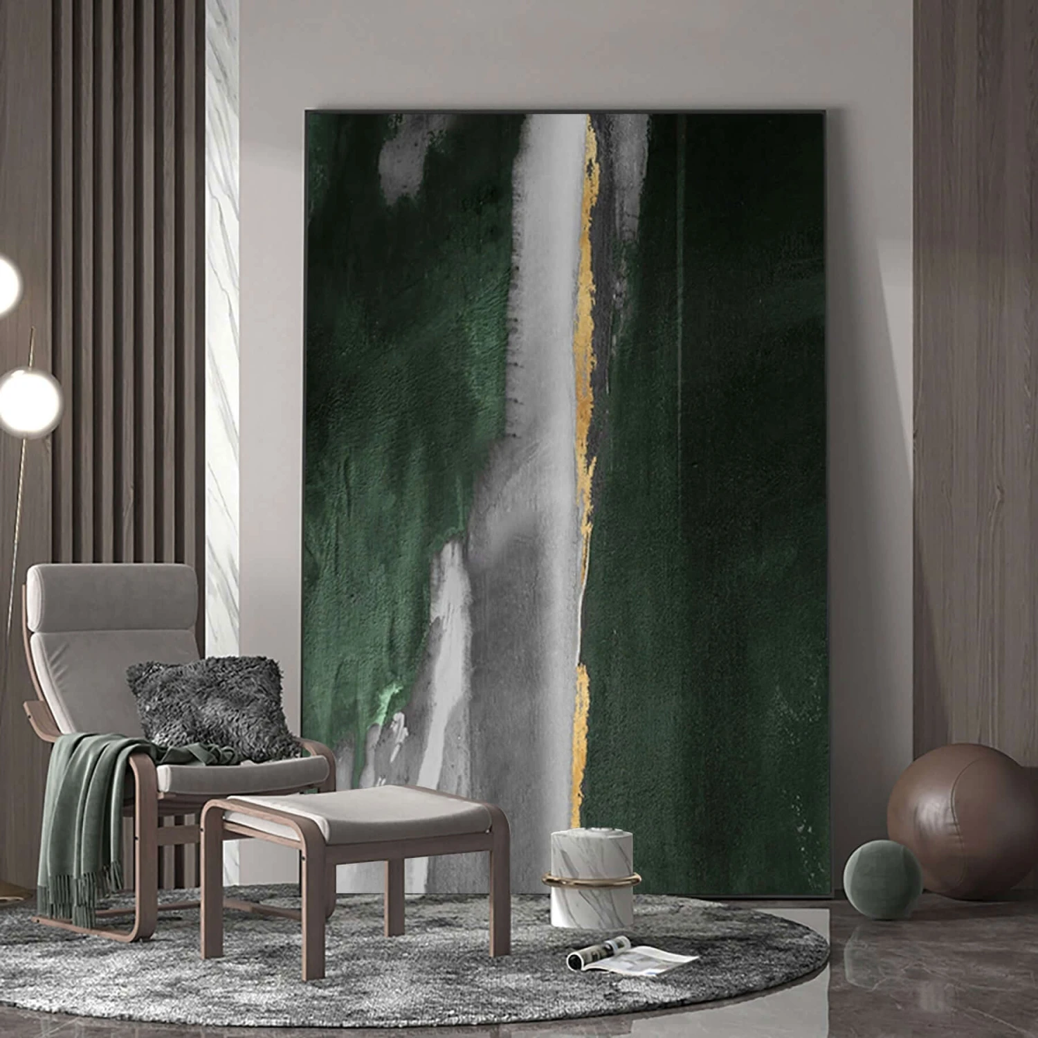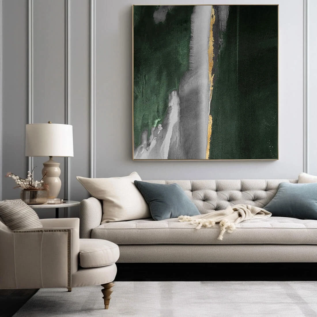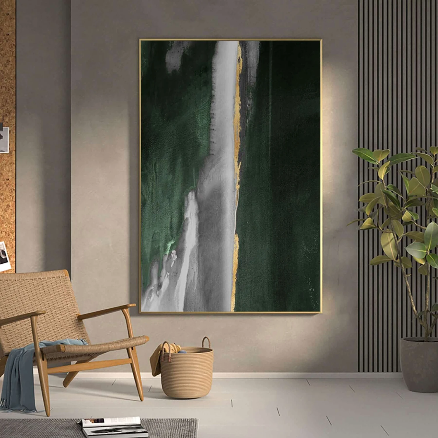 Emerald’ is a beautiful abstract artwork with deep greens, soft grays, and shimmering gold accents. It captures the beauty of nature and adds elegance to any room. This stunning piece will bring vibrant energy and sophisticated charm to your home.