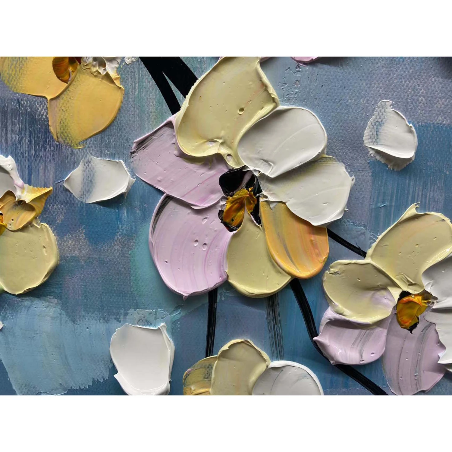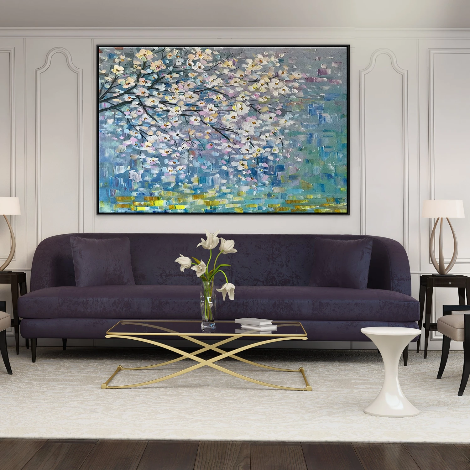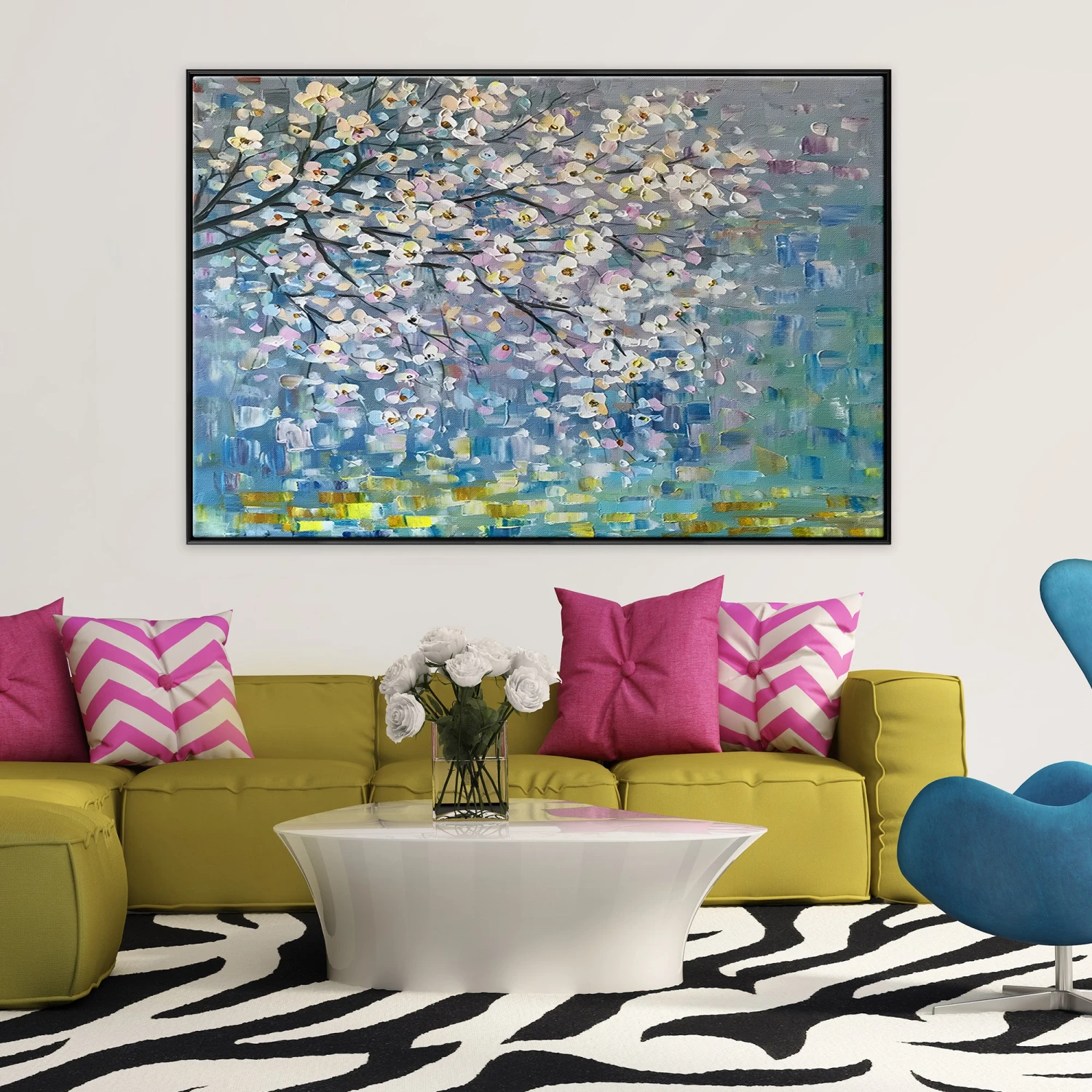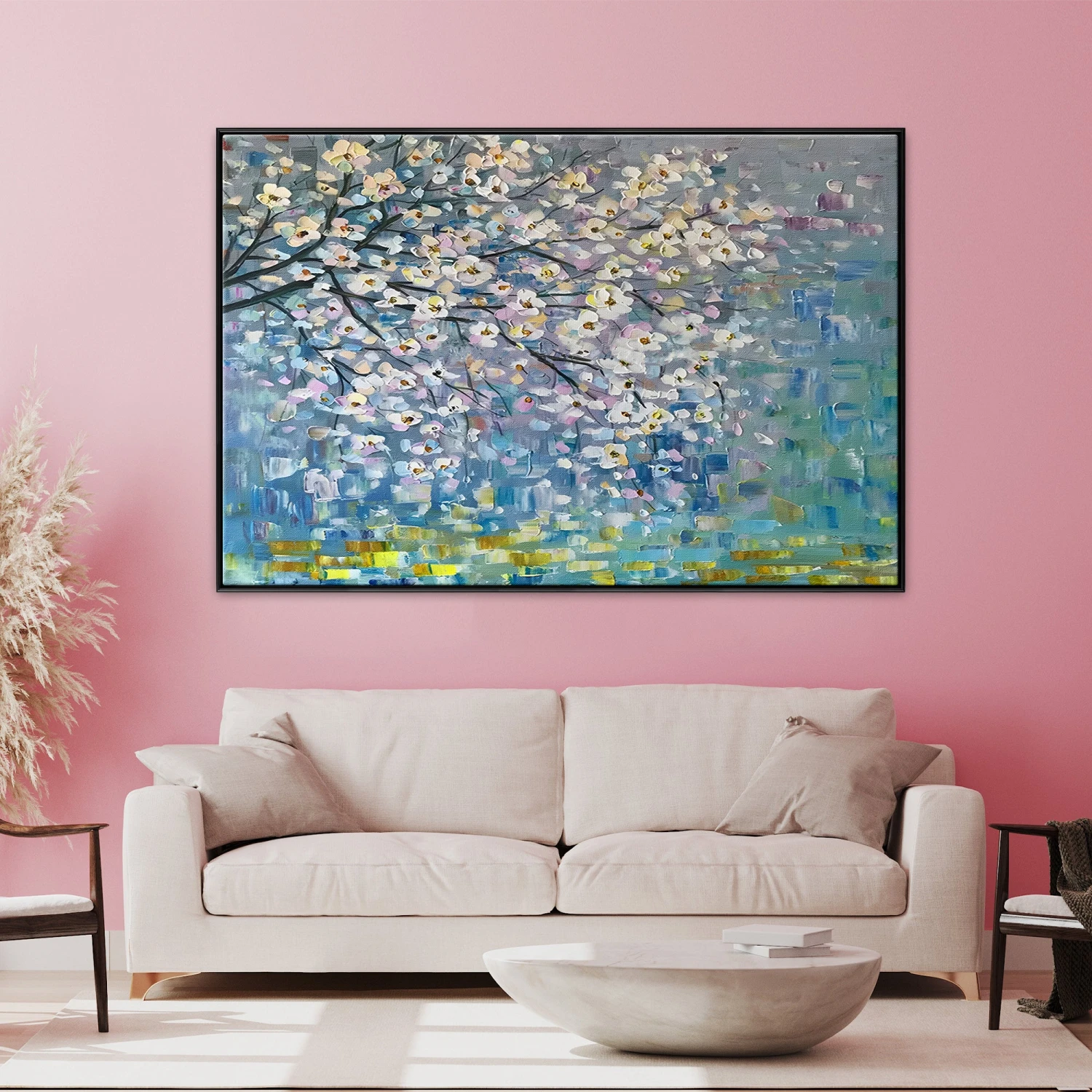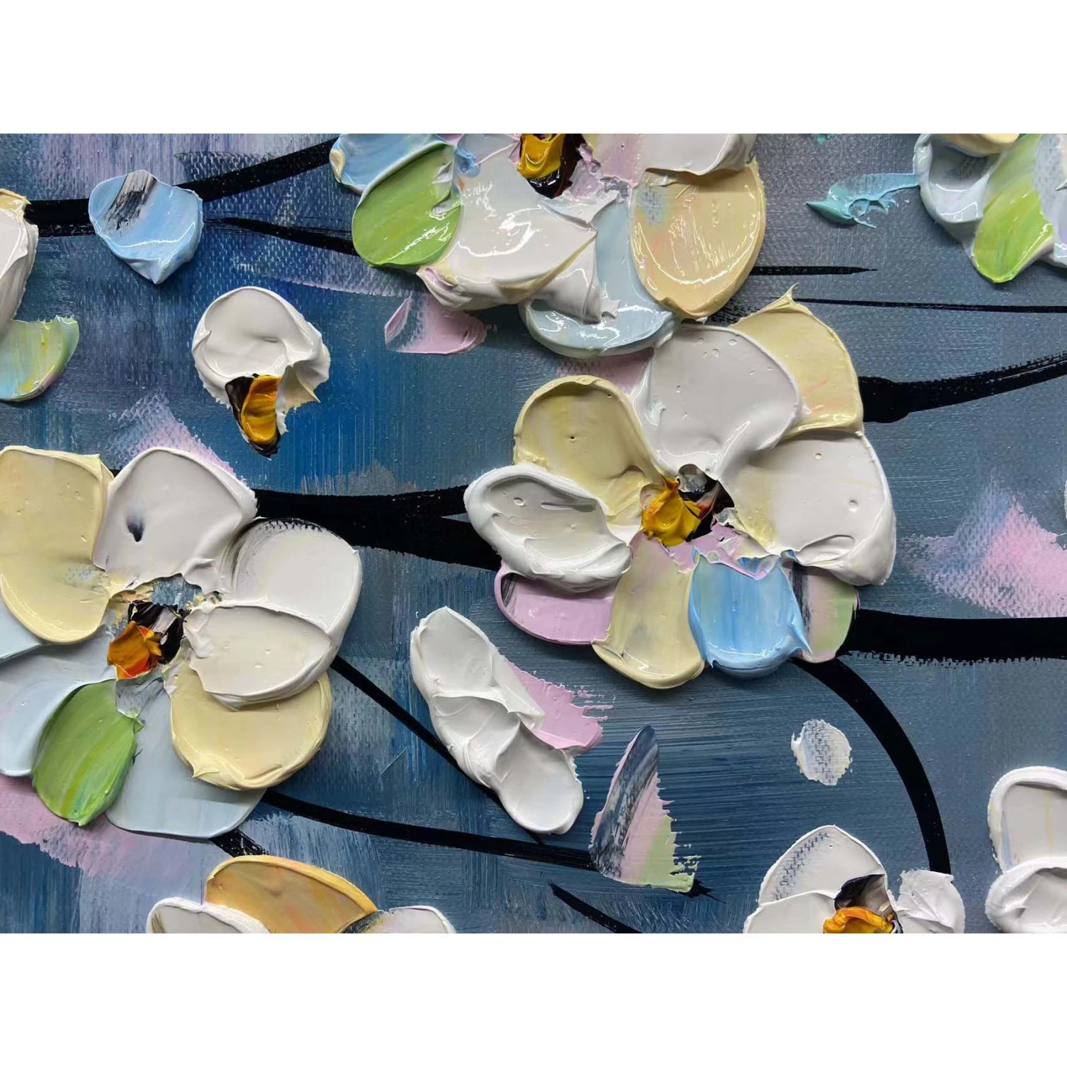 “Ikebana” portrays a Japanese tree with charming white blossoms against a vibrant blue background. It captures the ethereal beauty of nature with an adorable touch that’ll light up a smile anytime you’ll look at it!