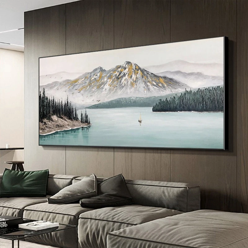 Experience the majesty of ‘King Peak.’ This stunning artwork showcases a majestic mountain range reflected in tranquil waters, providing a serene and sophisticated touch to any space.