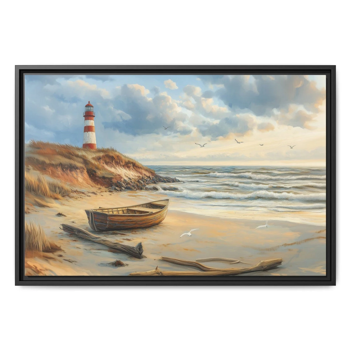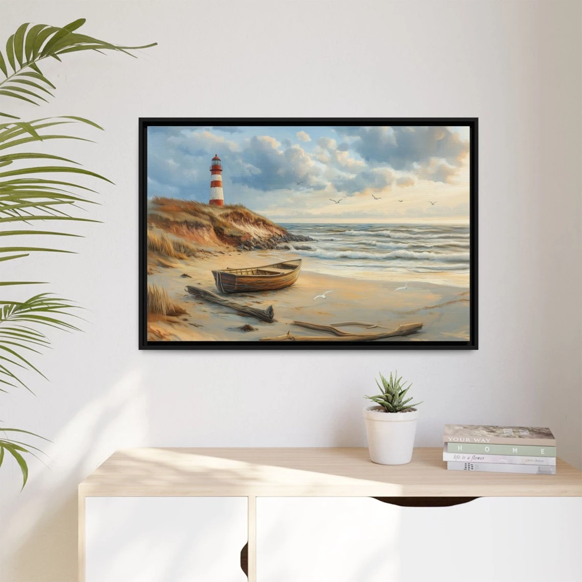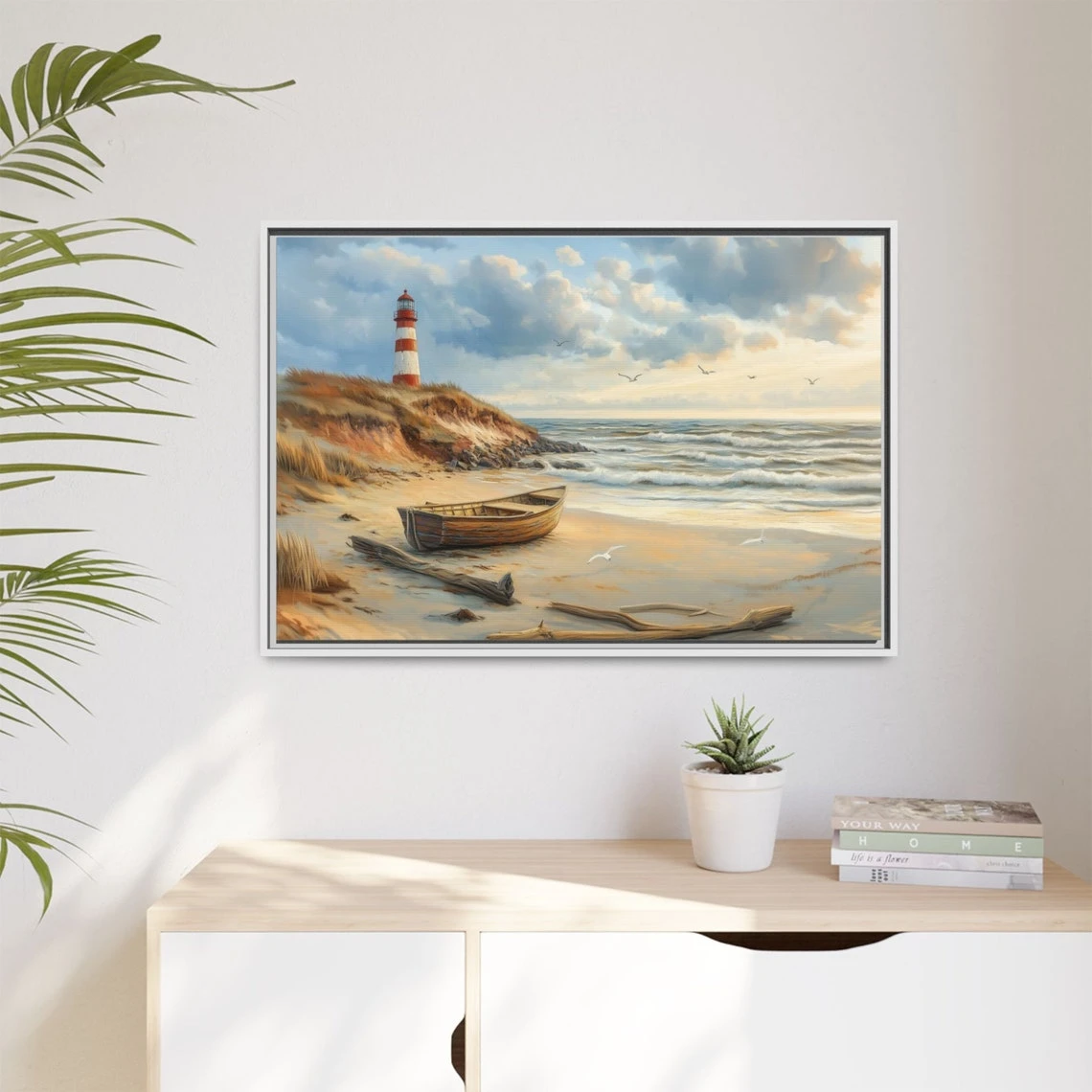 With soft clouds, golden dunes, and a classic lighthouse standing tall, this painting transports you straight to the coast. The gentle waves and the nostalgic atmosphere make it an ideal piece for anyone dreaming of a seaside escape.