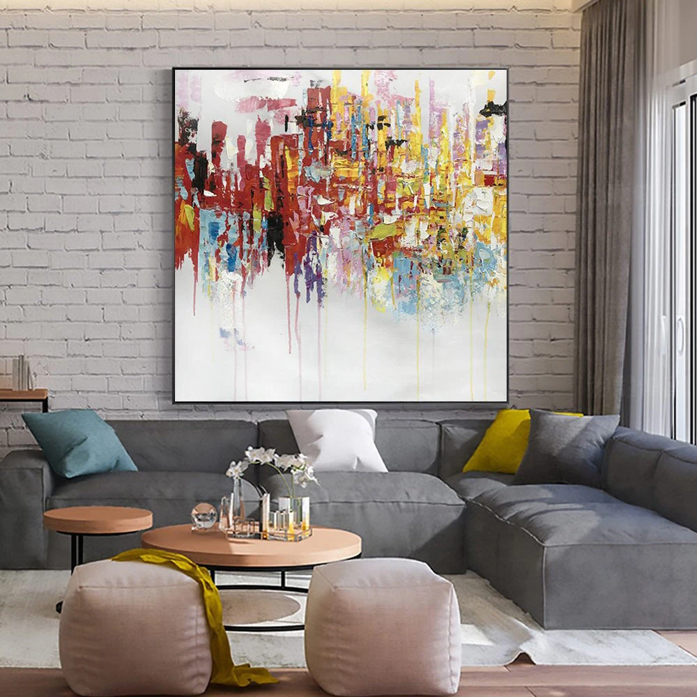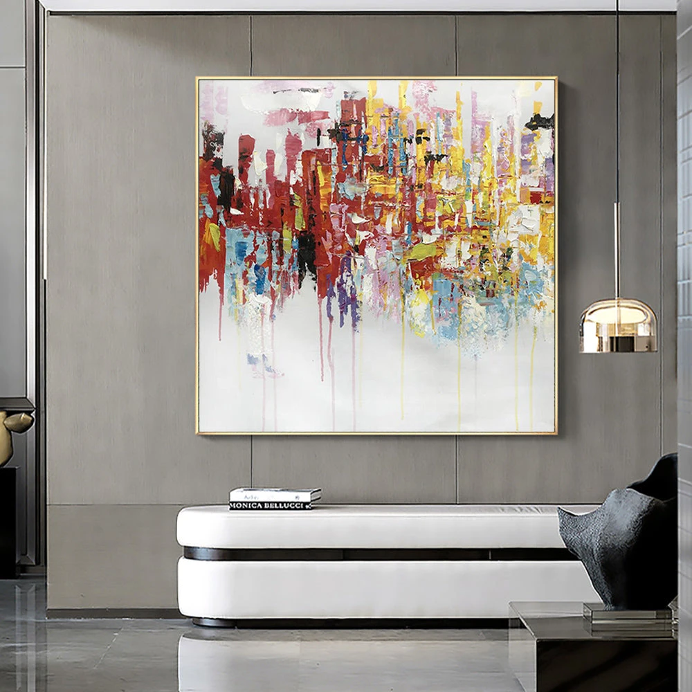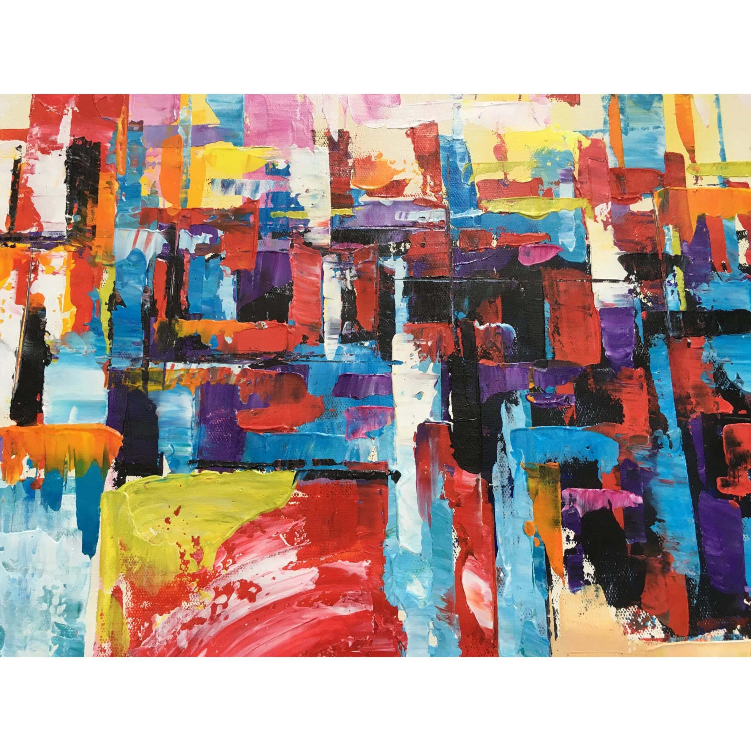 Always sunny, beautiful architecture and the best tapas in the world, this is Madrid! With its vibrant and energetic colours this painting takes you somewhere else! Whether you see a crowd of people or a colourful skyline, this abstract art piece keeps surprising you!