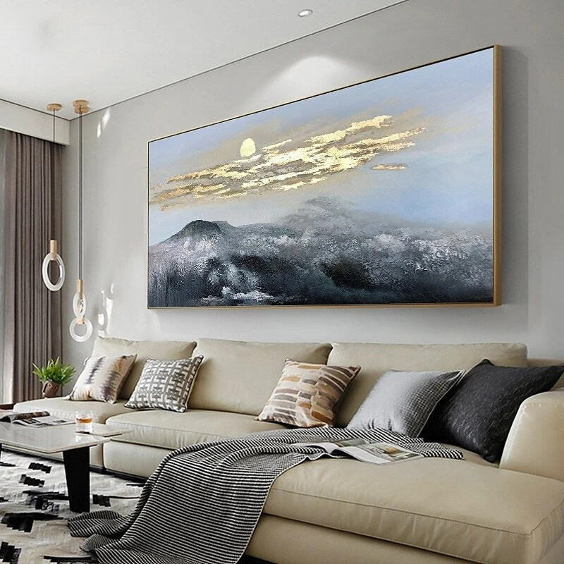 With mountain tops so high that they almost touch the sky, these ‘Misty Moon Mountains’ are a beautiful sight to behold. The golden mist floats like a beautiful blanket over the snowy summit. This gives the artwork a sense of mystery and sophistication!