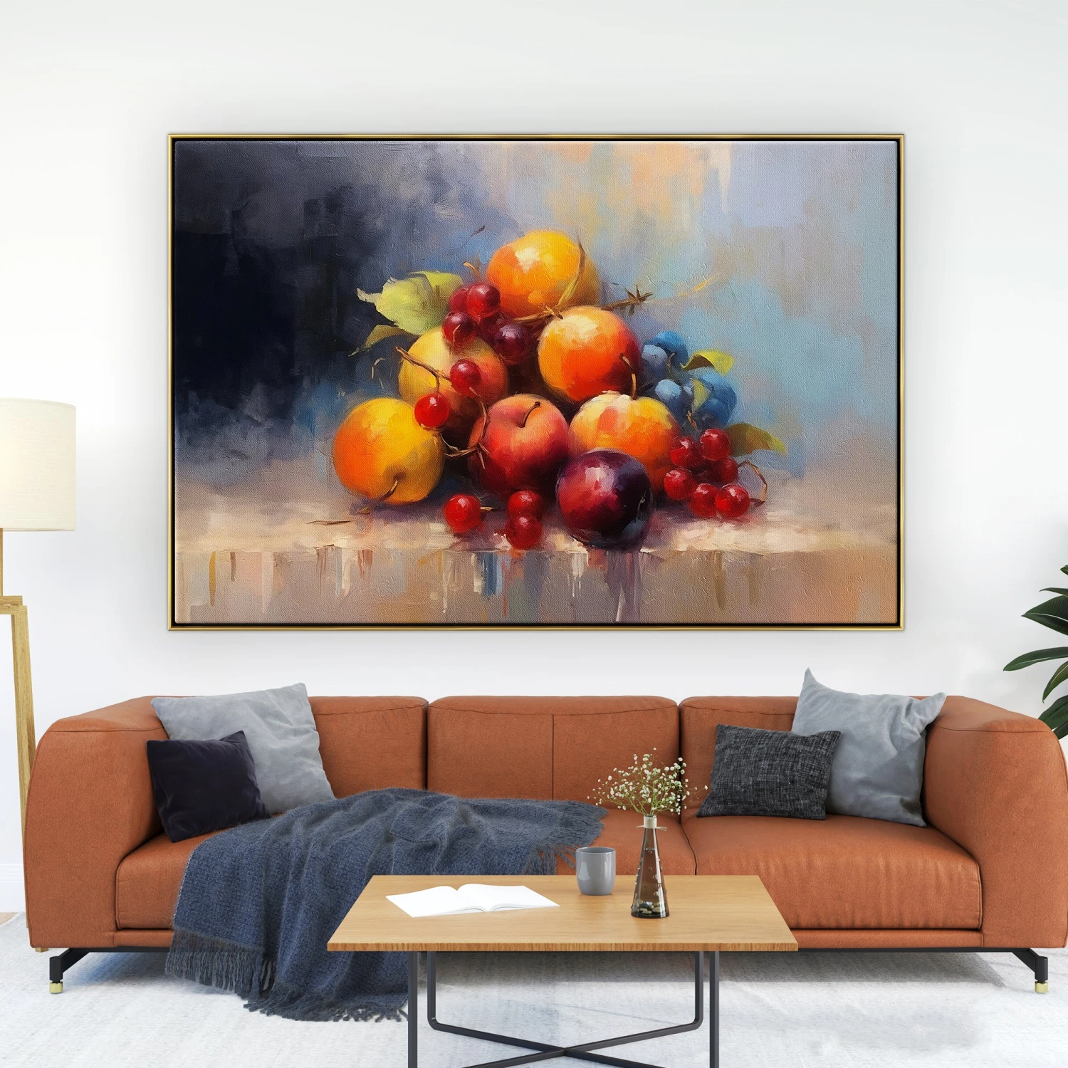 Experience a palette of freshness in this modern still life. The artwork captures the vibrant colors and vitality of fruits, making it a lively and eye-catching addition to your surroundings.