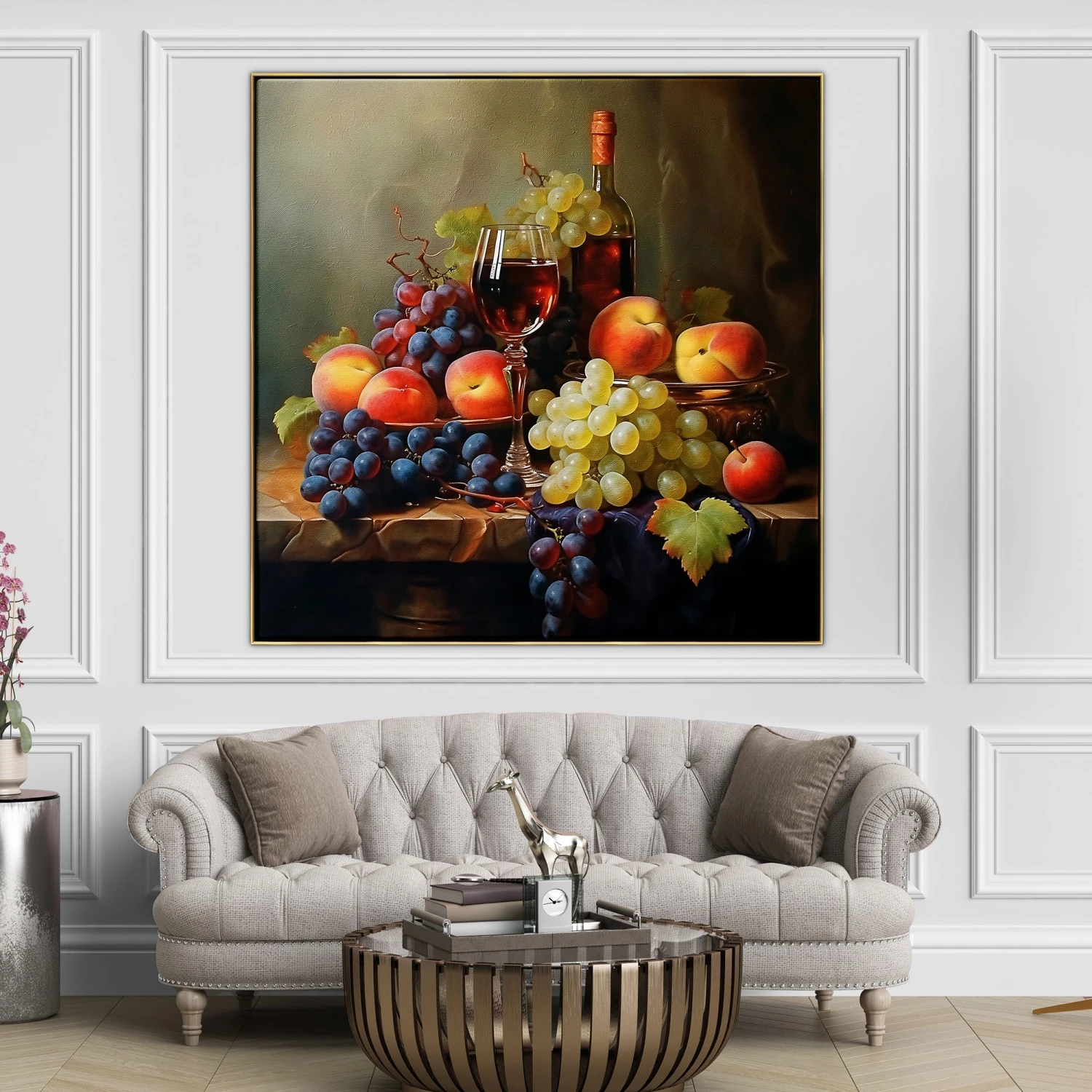 Shades of red come alive in this still life piece, where the velvety notes of Shiraz meet the lush textures of fruits. The stunning realism-style makes this piece a great addition to any home interior.