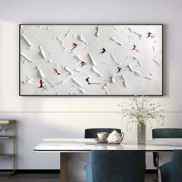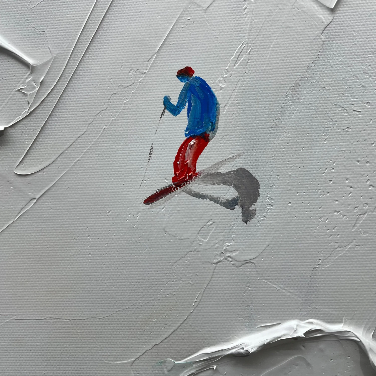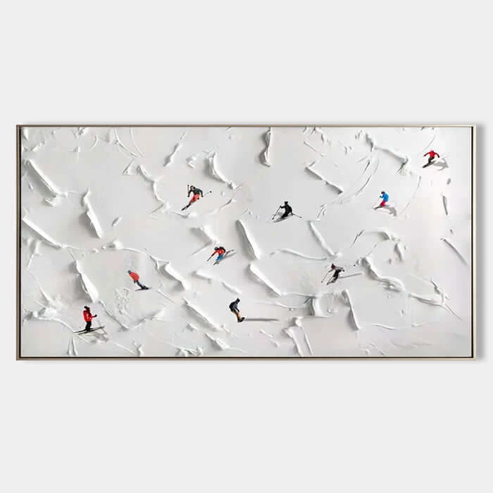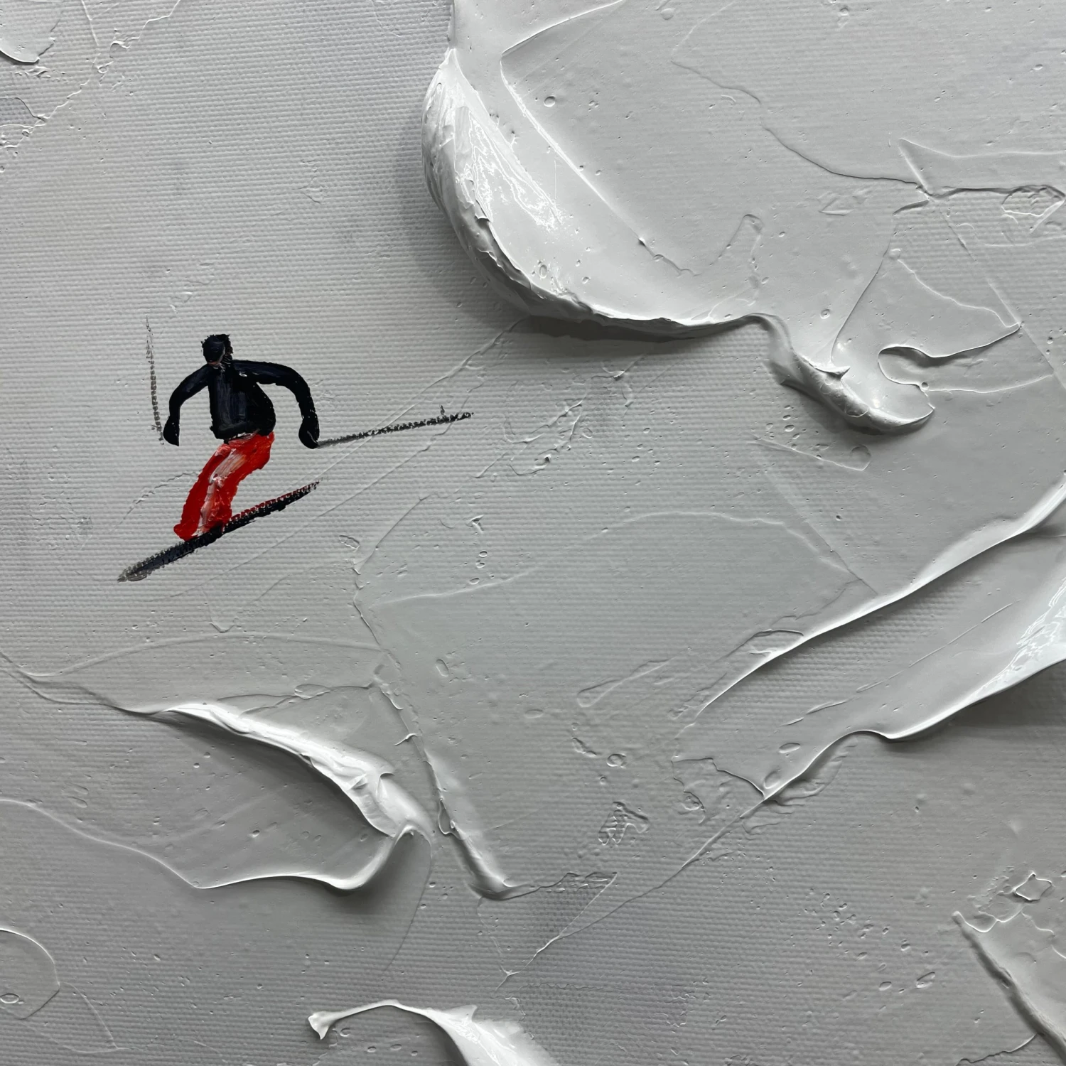 Look at these brave skiers go! They conquer the mountain with great style and finesse, creating a beautiful composition. The many painting techniques used in this painting make these winter athletes really pop out of the canvas! Making this a rich and unique addition to any home interior!