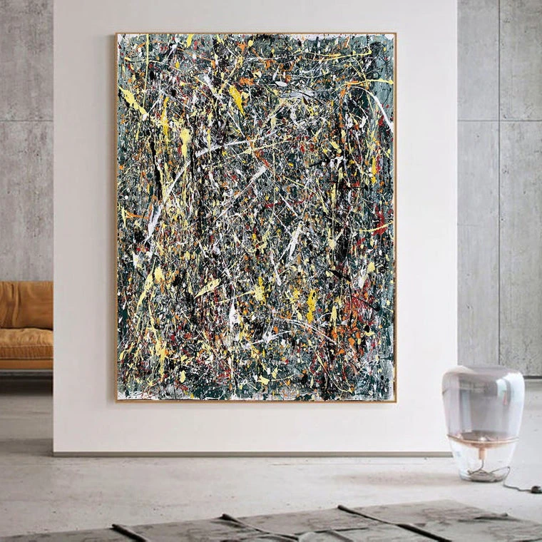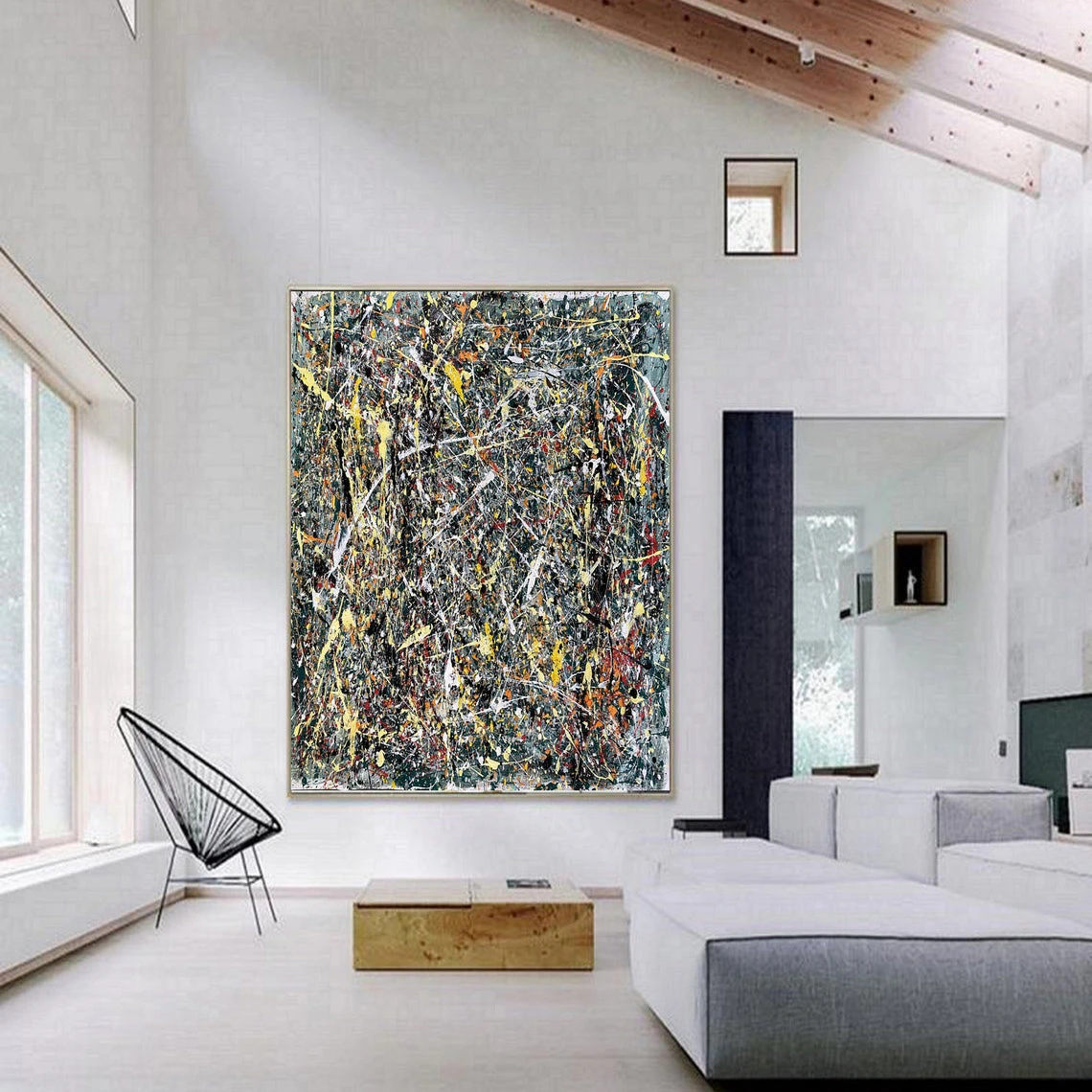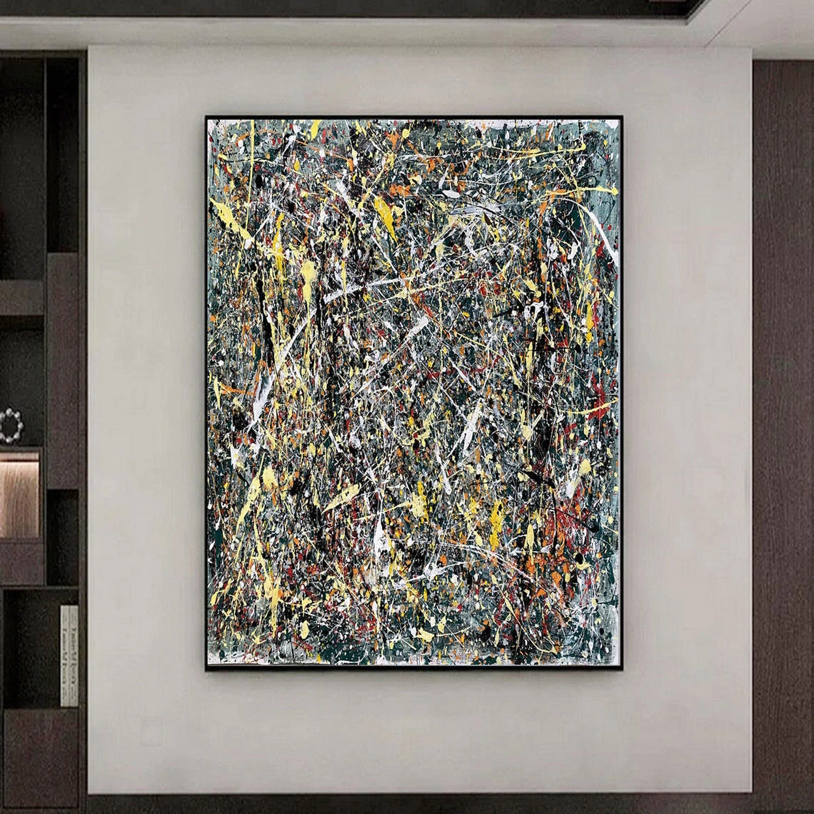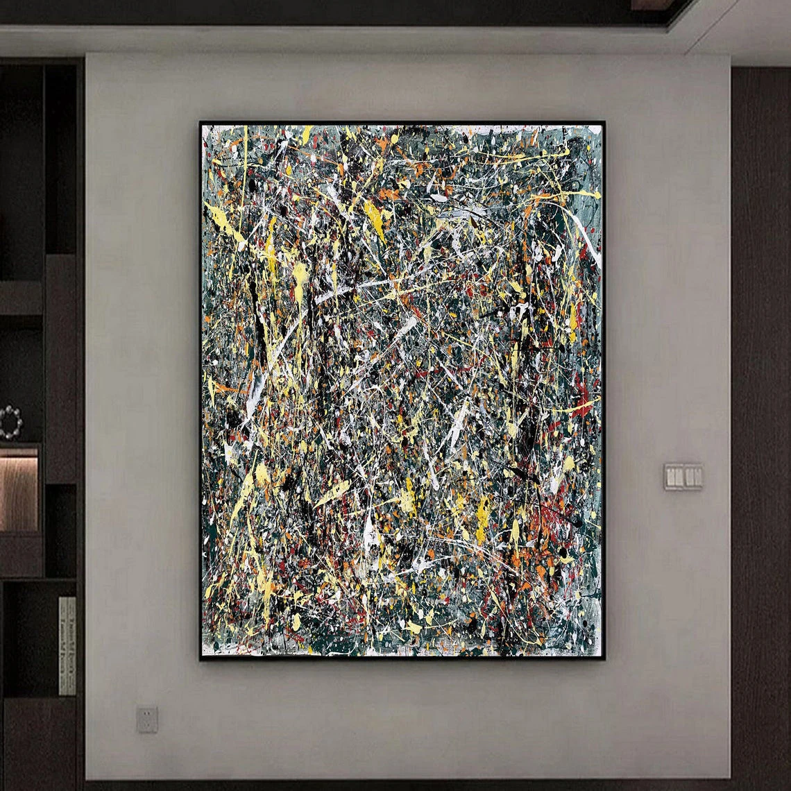 Pollock’s inspired ‘Solemn’ captures the quiet energy of reflection through its intricate web of colors and movement. This painting balances bold strokes with deep thought, making it a striking yet meditative addition to your space.