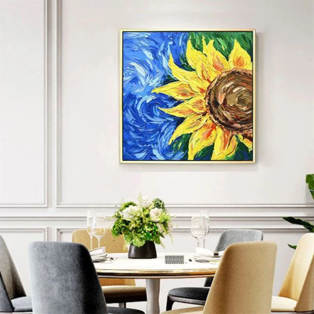 “Sunflower Days” is a burst of sunshine! The golden sunflower comes alive with bold strokes, surrounded by a swirling blue sky. It’s the perfect way to bring nature’s brightness into your home, no matter the season.