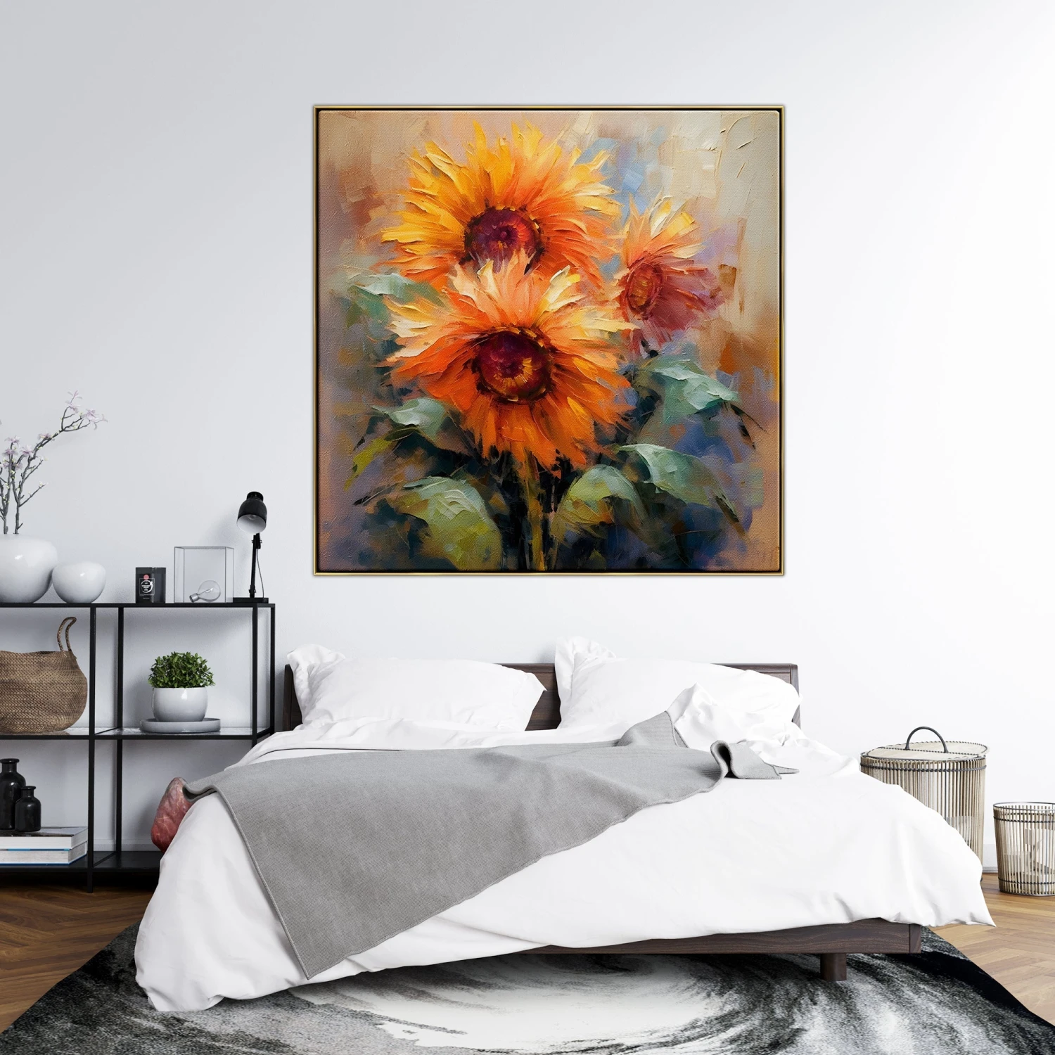 Brighten your days with this vibrant painting of sun-kissed sunflowers! The vivid colors and amazing texture really makes these flowers pop, creating a warm and welcoming atmosphere anywhere.