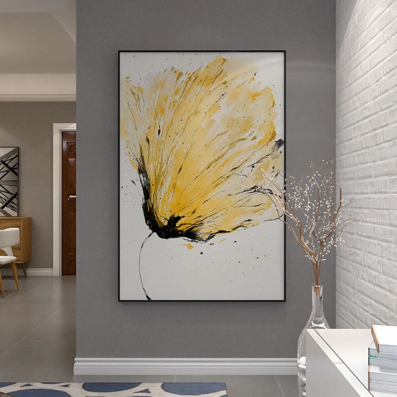 This modern artwork beautifully portrays a golden lily opening up! With the subtle and contrasting colors yellow and black, this painting will look stunning alongside any home interior.