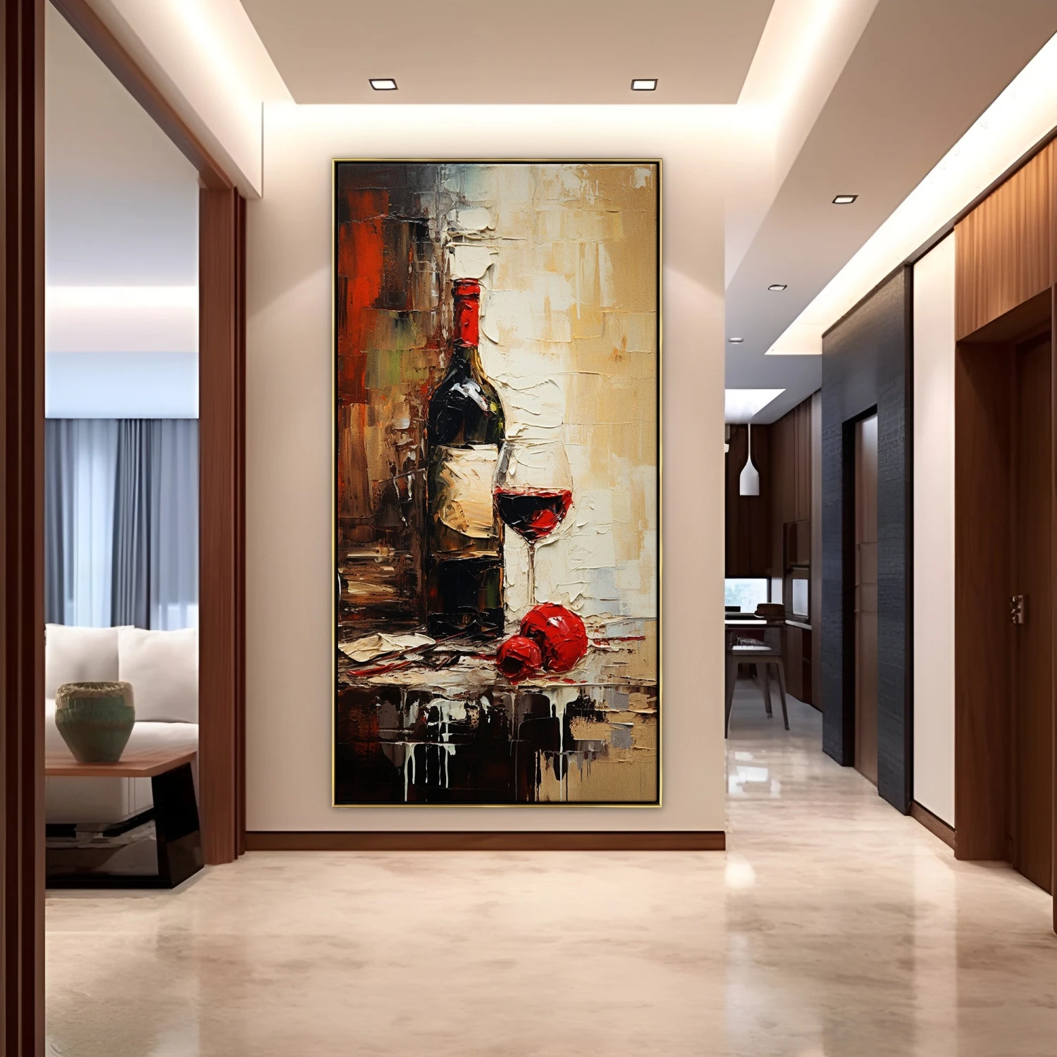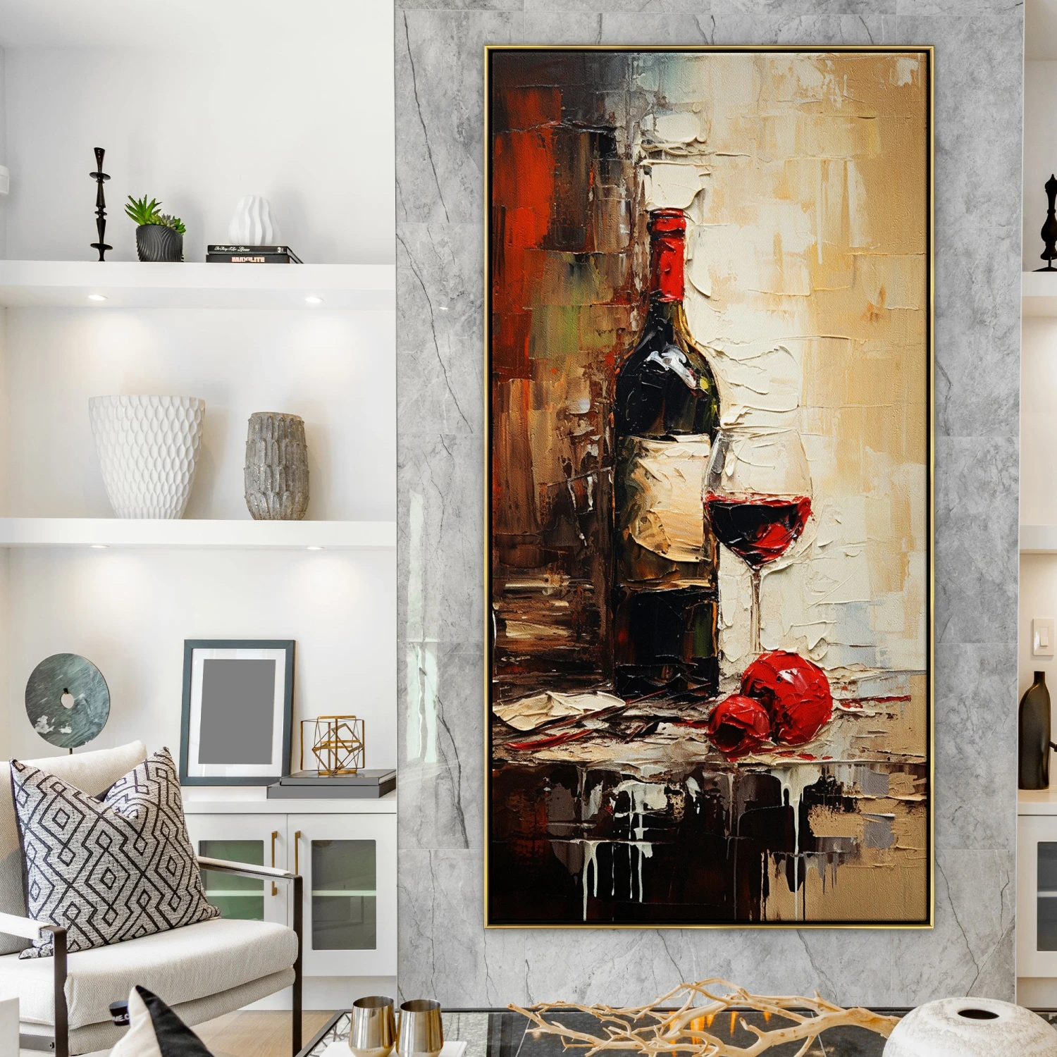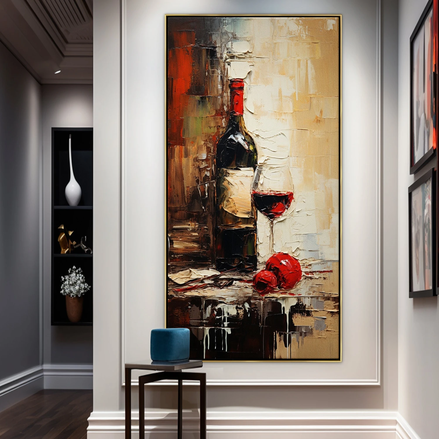 This art piece portrays a wine bottle and glass with a touch of impressionism. Each brushstroke captures the essence of a wine’s journey from vineyard to glass in a burst of color.