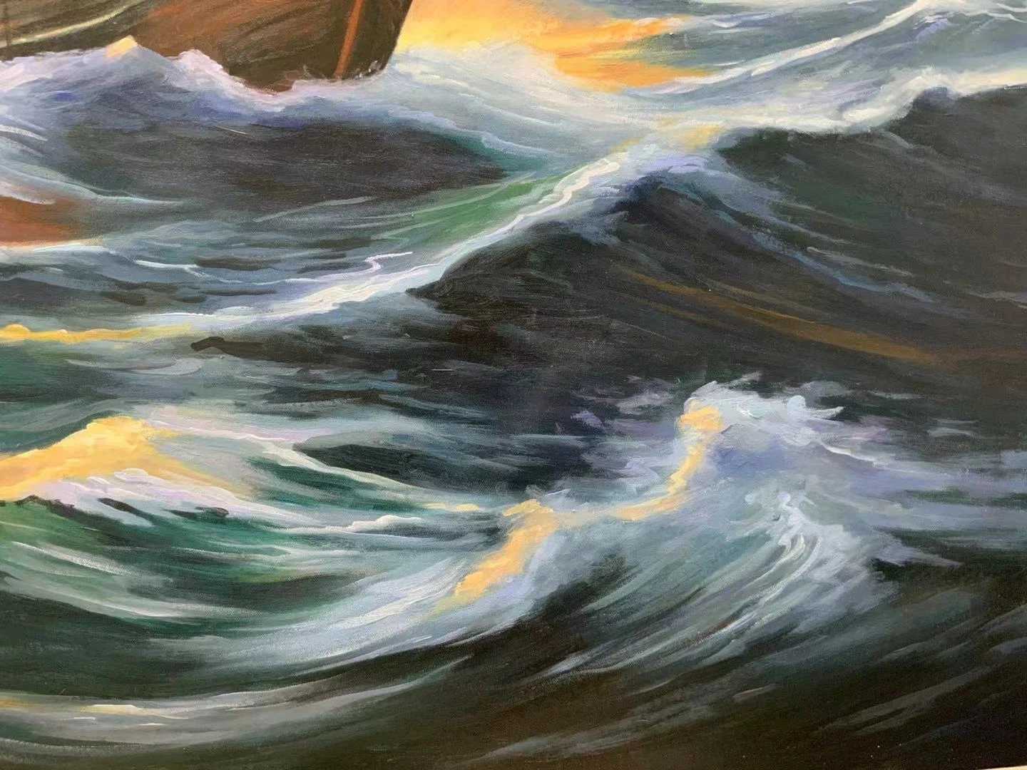 With the wind in her back and the setting sun on the horizon, ”The Pioneer” is on route for discovery. No storm is too big and no journey is too hard for this mighty ship, as she fills the canvas with an epic grandeur.