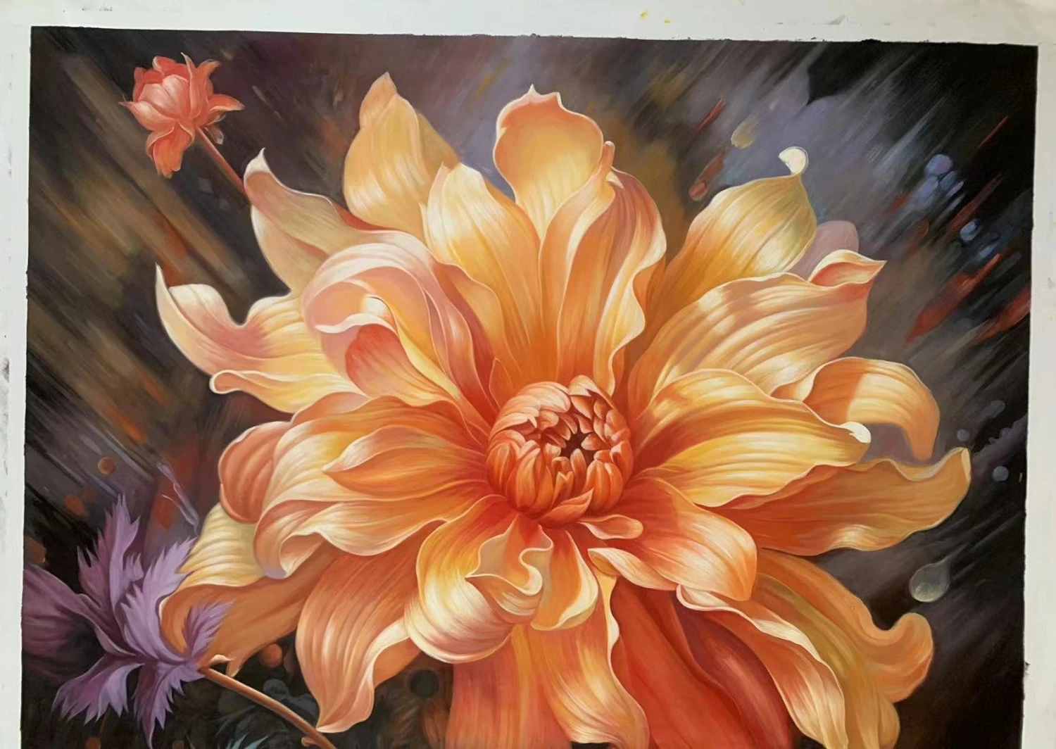 In “Versilla,” a radiant orange flower takes center stage, kissed by the sun’s glow. The exquisite realism-style and radiating warmth of this artwork make it a vibrant addition to any space or room.